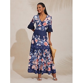 Pentru femei Uzura de resort Rochie Maxi Bleumarin Lungime Manșon 3/4 Folk Imprimare Primavara vara În V Timp Liber Vacanta la plaja S M L