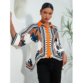 Cămașă de damă din satin de mătase, neagră, imprimare în blocuri de culori, mânecă 3/4, guler cămașă, vacanță, casual, zilnic, primăvară, vară, toamnă