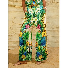 Pantaloni largi din satin, cu imprimeu floral geometric, pentru vacanță, casual