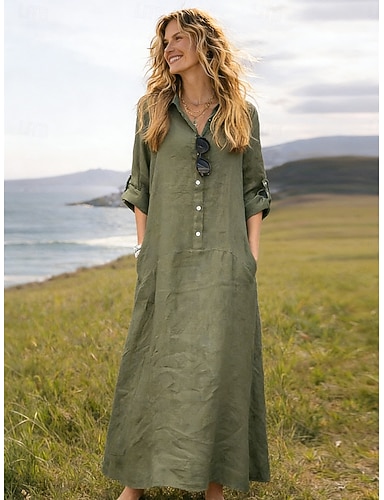 Pentru femei Rochie Maxi In din bumbac artificial Rochii Tip Cămașă Rochie casual De Bază Casual Zilnic Vacanță Fit regulat Simplu Manșon Lung Guler Cămașă Roz Îmbujorat Trifoi Gri Primăvară Toamnă