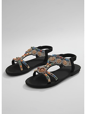 Sandale boeme pentru femei, cu mărgele și broderie etnică – pantofi de vară comozi și plați pentru plajă, călătorii și ieșiri casual