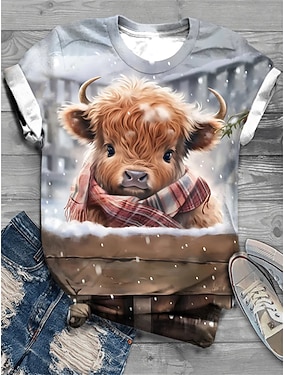 Tricou pentru femei Unisex cu imprimeu cu vacă Highland Fular Temă de iarnă Gât rotund Mâneci scurte Îmbrăcăminte casual Material moale Ajustare standard Tricou cu grafic de animale