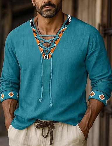 Bărbați Cămașă Cămașă de in Cămașă popover Cămașă de vară Costum de plajă cămăși retro Έθνικ Vacanță Stradă Trifoi Manșon Lung În V Vară Primăvară Îmbrăcăminte