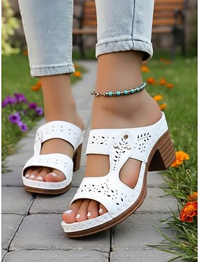 Sandale albe cu imprimeu floral pentru femei – toc bloc jos și moale, cu amortizare, stil elegant de vară pentru doamne, perfecte pentru vacanțe, evenimente în grădină, plimbări și purtare zilnică