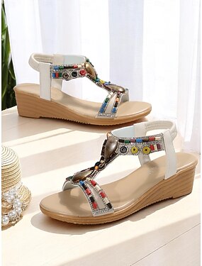 Sandale boeme albe pentru femei cu platformă - pantofi tip espadrilă cu mărgele colorate și accente de pietre prețioase pentru vacanțe la piscină, petreceri de vară pe plajă &ținute de lux pentru
