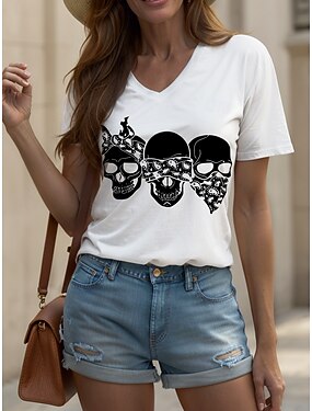 Tricou pentru femei cu grafică cranii pisică vintage stilat clasic cu mâneci scurte guler în V tops obișnuite imprimeu zilnic alb și negru negru alb galben roz vară-primăvară