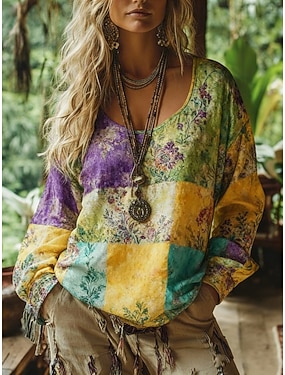 Pentru femei Tricou Boho Tricou Tee Top Imprimeu Floral Bloc Culoare Epocă Έθνικ Casual Manșon Lung În V Topuri lungi Zilnic Sfârșit de săptămână Îmbrăcăminte de vacanță Galben Mov Vară Primăvar