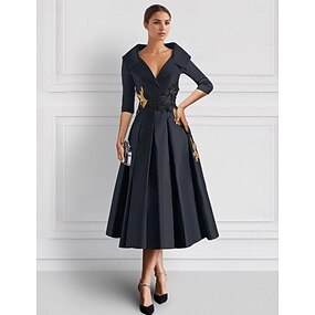 Rochii cocktail A-line brodate Rochie de tuxedo Mamă a Miresei Elegantă Formală Lungime până la gleznă Mâneci 3/4 Guler de cămașă Buzunar din satin cu aplicații