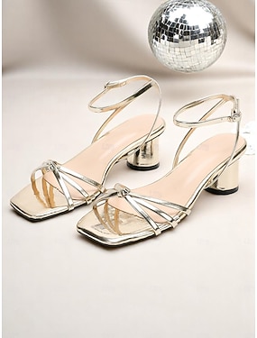 pantofi cu toc bloc cu curele la gleznă metalice aurii pentru femei – sandale lucioase pentru petrecere de cocktail, cu vârf pătrat și toc jos