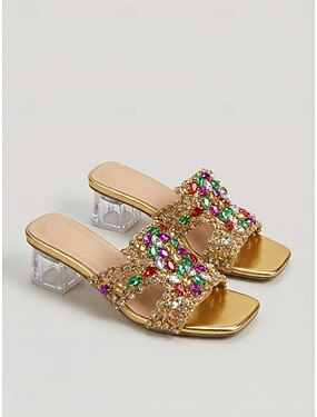 Sandale aurii pentru femei cu toc înalt și strasuri, pantofi de petrecere cu toc bloc și vârf deschis și toc de cristal pentru viața de noapte, cluburi &aspect glamuros