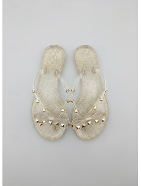 Sandale aurii metalice cu bareta în T pentru femei - șlapi eleganți cu detalii strălucitoare în formă de glob de cristal pentru vacanțe pe insulă sau stațiuni de plajă &ieșiri de vară