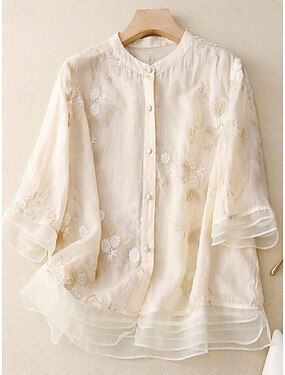 Pentru femei Cămașă Buton Sus Bluză In din bumbac artificial Brodat Nasturi Floral De Bază Casual Lungime Manșon 3/4 Gât Înalt Topuri obișnuite Zilnic Galben Mov Trifoi Bej Vară Primăvară Toamnă