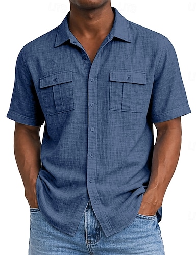 Bărbați Cămașă Cămașă de in Cămașă casual Camașă cu nasturi Cămașă din bumbac Simplu Casual Plajă Albastru piscină Negru Alb Roz Îmbujorat Manșon scurt Răsfrânt Vară Îmbrăcăminte Simplu