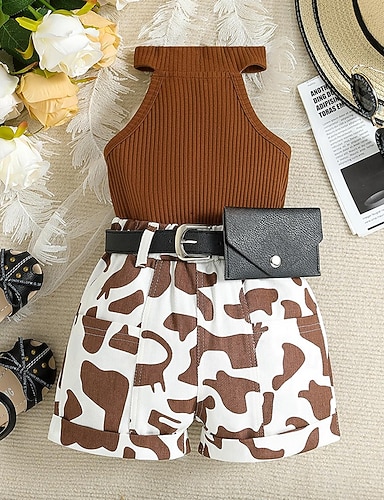 Fete 3D Culoare solidă Imprimeu Leopard Maieu și Pantaloni scurți Fără manșon Vară Modă Casual Copil 4 ani + În aer liber Potrivire Largă