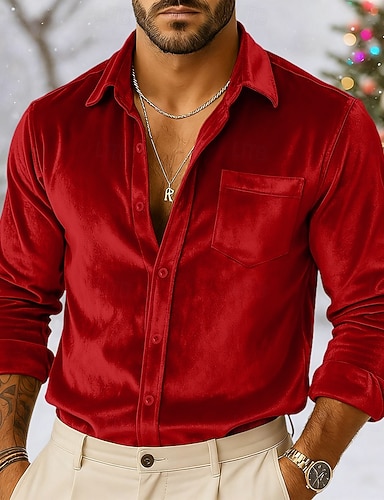 Bărbați Cămașă Cămașă casual Cămașă de Crăciun Cămașă de catifea Roșu Vin Albastru regal Maro Trifoi Manșon Lung Culoare solidă Simplu Guler Cămașă Carnaval Crăciun Buzunar Îmbrăcăminte Crăciun