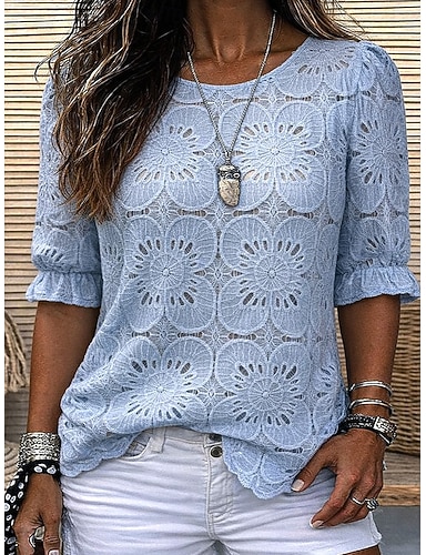 Pentru femei Top cu dantelă Bluză Dantelă Peteci Culoare solidă Stilat De Bază Casual Manșon scurt Stil Nautic Topuri obișnuite Zilnic Albastru piscină Negru Alb Roz Îmbujorat Vară Primăvară