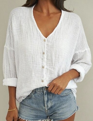 Pentru femei Bluză Cămașă din imitație de in Nasturi Culoare solidă Zilnic Stilat De Bază Lungime Manșon 3/4 În V Topuri obișnuite Zilnic Albastru piscină Alb Galben Trifoi Gri Vară Primăvară Toamnă