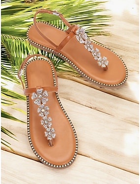 sandale tanga de damă, cu flori de strass, cu margini împânzite – sandale plate elegante pentru vară, plajă și ocazii casual