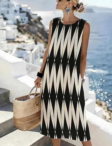 Pentru femei Rochii Midi Rochie din Tricot Modă Romantic Clasic Zilnic Plajă Vacanță Fit regulat Geometric Fără manșon Stil Nautic Negru Alb Portocaliu Vară