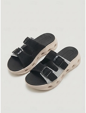Sandale negre pentru femei cu cataramă dublă – sandale sport tricotate respirabile cu suport pentru arcul piciorului, sandale confortabile și fără slip-on pentru vară, călătorii &purtare de zi cu zi