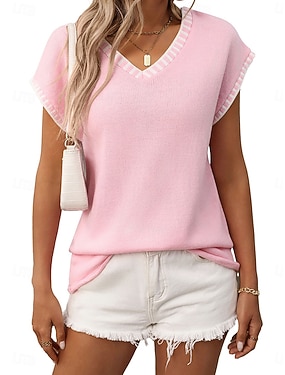 Pentru femei Pulover Plover Elegant Modă Șic Stradă Culoare solidă În V Tricotat Mânecă scurtă Topuri obișnuite Tricotat Zilnic În aer liber Sfârșit de săptămână Negru Roz Îmbujorat Vară Primăvară