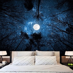 Tapiserie de perete cu galaxie, pădure de noapte, lună plină, cer înstelat, siluete de copaci, albastru închis, peisaj natural, suspendată pentru dormitor, living, cămin, decor estetic pentru cameră