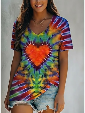 Pentru femei Tricou Imprimeu Inimă Grafic Cravată Boemia Epocă Casual Manșon scurt În V Topuri obișnuite Zilnic Curcubeu Vară Primăvară