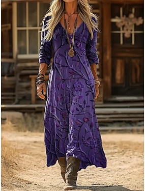 Pentru femei Rochie Lunga Rochie Maxi Rochie Boho Rochie casual Rochie etnică Epocă Zilnic În aer liber Vacanță Fit regulat Floral Manșon Lung În V Mov Vară Primăvară Toamnă