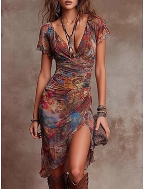Pentru femei Rochii Lungime Genunchi Rochie teacă Rochii din Șifon Rochie imprimata Elegant Modă În aer liber Vacanță Ieșire Fit regulat Grafic Manșon scurt În V Roșu Vin Vară Primăvară