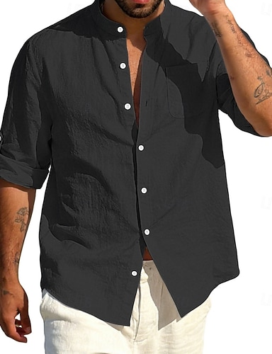 Bărbați Cămașă Cămașă de in Cămașă de vară Costum de plajă Cămașă cu guler bandă Cămașă cu guler de bunic Simplu Casual Vacanță Albastru piscină Negru Alb Kaki Manșon Lung Guler mandarin Var