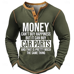 Tricou de bărbați amuzant pentru pasionații de mașini mânecă lungă pe stil Henley - 'Banii nu pot cumpăra fericirea dar piesele de mașină da'