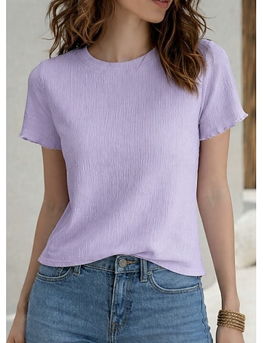 Pentru femei Tricou Texturat Tee Top Bufantă Culoare solidă Elegant Modă Drăguţ Manșon scurt Stil Nautic Rotund Topuri obișnuite Casual Zilnic Ieșire Negru Alb Mov Vară Primăvară