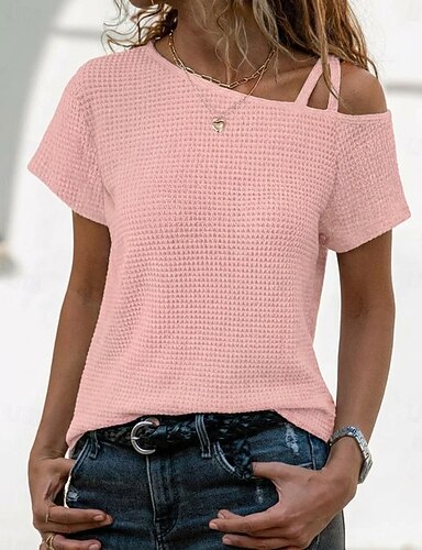 Pentru femei Tricou Culoare solidă Epocă Stilat Manșon scurt Gât asimetric Topuri obișnuite Zilnic Ieșire Sfârșit de săptămână Negru Alb Roz Îmbujorat Verde Militar Kaki Vară Primăvară