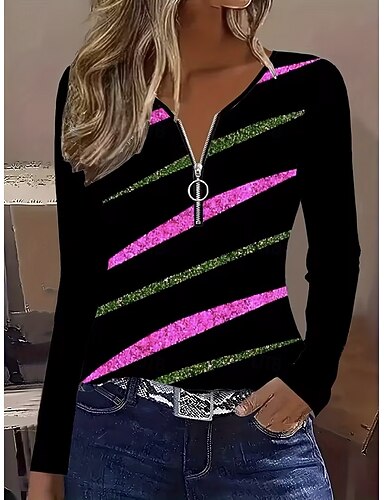 Pentru femei Tricou Fermoar Imprimeu Grafic Geometric Epocă Modă Stilat Manșon Lung Stil Nautic În V Topuri obișnuite Zilnic Albastru piscină Mov Trifoi Primăvară Toamnă Iarnă