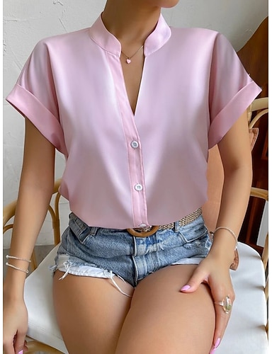 Pentru femei Bluză Nasturi Simplu Elegant Zilnic Stilat Manșon scurt În V Topuri obișnuite Zilnic Albastru piscină Negru Roz Îmbujorat Portocaliu Trifoi Vară Primăvară