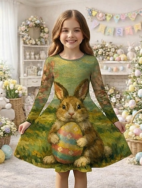 Paște Girls ' 3D Grafic Iepure Rochie Manșon Lung Tipărire 3D Primăvară Toamnă Zilnic Vacanță Petrecere Casual Prințesă Frumoasa Copii 4-12 ani Rochie casual Rochie A line Lungime Genunchi Fit regulat