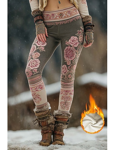 Pentru femei colanți căptușiți cu fleece Jambiere Vacanță Epocă Stilul etnic Lungime totală Talie Înaltă Floral Grafic Imprimare 3D Termic cald Rezistent la Vânt Confortabil Strech Zilnic Casă Vacanță