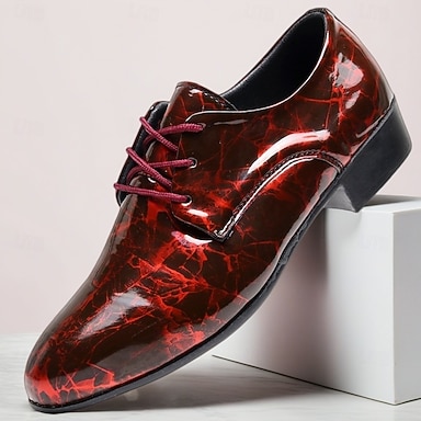 Pantofi Oxford bărbătești, din piele lăcuită, marmorată roșie și neagră, cu șireturi, încălțăminte elegantă, pentru nunți, banchete, petreceri, baluri de absolvire, spectacole și ținute de seară la modă
