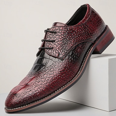 Pantofi eleganți bărbătești din piele ecologică, de culoare vișinie – pantofi formali cu șireturi în relief cu model crocodil pentru nuntă, afaceri și petrecere
