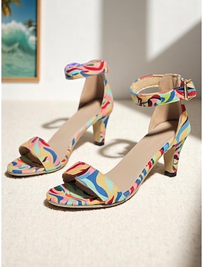 sandale cu toc cu curele la gleznă imprimate colorate pentru femei – pantofi artistici vibranti de vară pentru petreceri la modă, ținute în stațiune și look-uri de vacanță