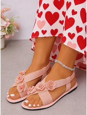 Sandale roz pentru femei cu model floral, cu baretă încrucișată și ornamente florale, pantofi casual romantici pentru Ziua Îndrăgostiților, întâlniri romantice, ieșiri de primăvară și purtare zilnică