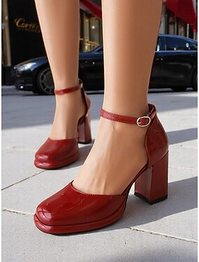 Pantofi sport roșii din piele lăcuită cu toc bloc pentru femei – pantofi eleganți cu bareta la gleznă, inspirați din anii 1950, pentru petreceri, serviciu și ocazii speciale