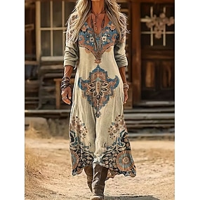 Rochie midi Boho rochie în A petrecere casual întâlnire potrivire obișnuită grafică paisley mânecă lungă decolteu în V albastru kaki vară primăvară