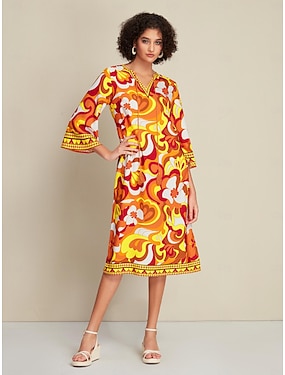 Pentru femei Rochie leagăn Rochie imprimata Rochie lejeră Rochie Maxi Portocaliu Mânecă până la Cot Linii / Valuri Imprimare Lung Primavara vara În V Casul Zilnic Plajă S M L