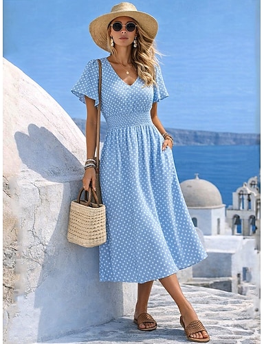 Pentru femei Rochii Midi Rochie A line Casual În aer liber Ieșire Fit regulat Buline Manșon scurt În V Albastru piscină Vară Primăvară