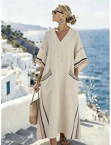 Rochie maxi pentru femei din in respirabilă ușoară rochie A-line rochie de vară casuală de zi cu zi potrivire largă striped cu mânecă 3/4 guler în V albastru alb roșu bej vară primăvară toamnă
