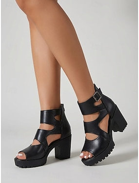 Sandale profesionale negre pentru femei cu toc bloc și sclipici - tocuri înalte elegante cu platformă și barete multiple &fermoar la spate pentru muncă de birou, banchete de afaceri &evenimente de