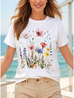 tricou de damă de bază cu imprimeu floral cu mânecă scurtă topuri obișnuite cu gâtul rotund sărbători verde de weekend