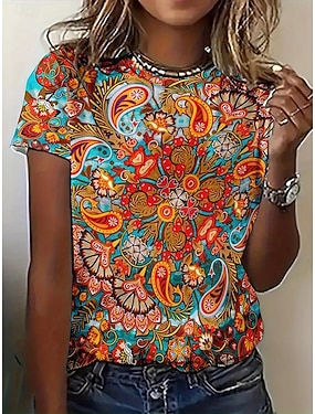 Pentru femei Tricou Imprimeu Grafic Tribal Stilat Clasic Casual Manșon scurt Stil Nautic Rotund Topuri obișnuite Casual Zilnic Albastru piscină Portocaliu Vară Primăvară
