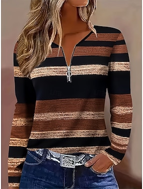 Pentru femei Tricou Fermoar Imprimeu Grafic Geometric Dungi Epocă Modă Stilat Manșon Lung Stil Nautic În V Topuri obișnuite Zilnic Maro Toamnă Iarnă